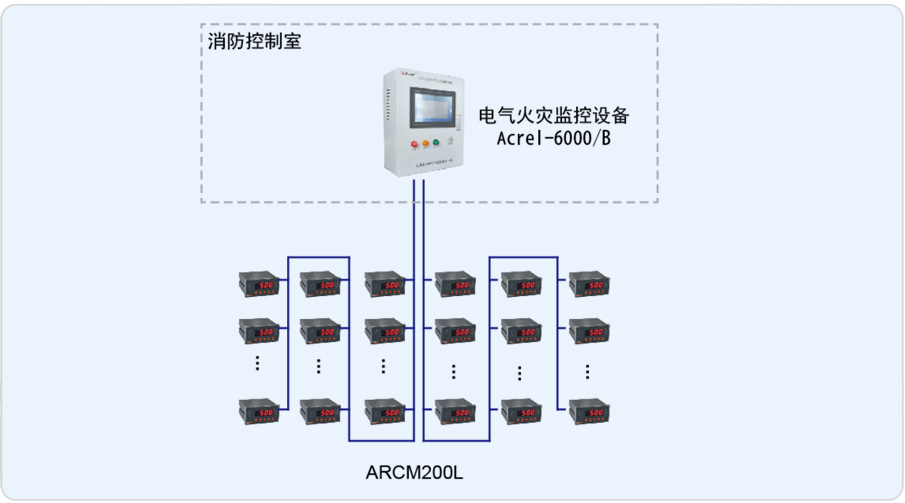 安科瑞于2014年9月承接了該項(xiàng)目電氣火災(zāi)監(jiān)控系統(tǒng),整套系統(tǒng)由壁掛式電氣火災(zāi)監(jiān)控裝置安科瑞Acrel-6000/B、ARCM200L剩余電流式火災(zāi)探測(cè)器組成。現(xiàn)場(chǎng)低壓配電柜內(nèi)探測(cè)器采用2條485總線接至消控中心的Acrel-6000/B壁掛式電氣火災(zāi)監(jiān)控系統(tǒng),當(dāng)現(xiàn)場(chǎng)保護(hù)線路中的被探測(cè)參數(shù)超過(guò)報(bào)警設(shè)定值時(shí),發(fā)出報(bào)警信號(hào)、控制信號(hào),指示報(bào)警部位并保存報(bào)警信息。