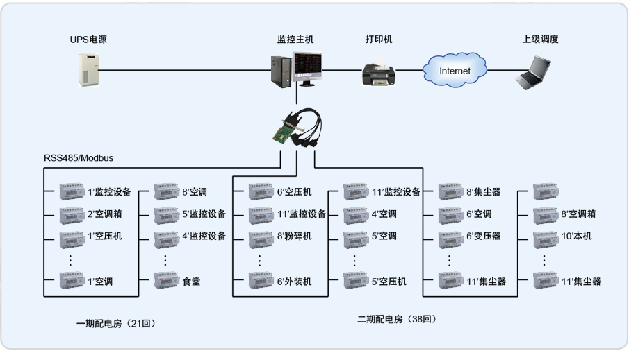整個(gè)系統(tǒng)采用分布式結(jié)構(gòu),監(jiān)控主機(jī)位于東區(qū)主辦公室內(nèi),一期配電房和二期配電房采用RS485總線直接接入監(jiān)控主機(jī)擴(kuò)展卡的串口。對(duì)于每個(gè)回路采用ADL 300-EF/C三相電能表,共59個(gè)回路;站控層應(yīng)用國(guó)內(nèi)知名的聯(lián)想商用計(jì)算機(jī)作為監(jiān)控主機(jī),同時(shí)設(shè)有用于報(bào)表打印輸出的打印機(jī);防止異常斷電而引發(fā)的數(shù)據(jù)丟失的UPS設(shè)備。監(jiān)控軟件平臺(tái)采用單機(jī)版Acrel-2000型電力監(jiān)控系統(tǒng)。Acrel-2000型電力監(jiān)控系統(tǒng)預(yù)留了擴(kuò)展接口,可方便進(jìn)行擴(kuò)展。