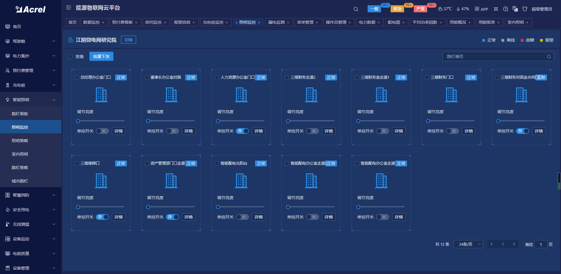 智能照明通過物聯網技術對安裝在城市各區域的室內照明、城市路燈等照明回路的用電狀態進行不間斷地數據監測,也可以實現定時開關策略配置及后臺遠程管理和移動管理等,降低路燈設施的維護難度和成本,提升管理水平,并達到一定節能減排的效果。