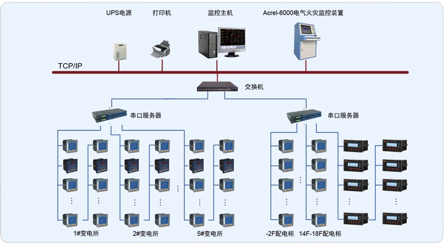 Acrel-6000電氣火災監控系統是安科瑞電氣股份有限公司自主研發的用于接收剩余電流式電氣火災探測器等現場設備信號,以實現對被保護電氣線路的報警、監視、控制、管理的運行于計算機的工業級硬件/軟件系統。本系統應用于大型商場、生活小區、生產基礎、辦公大樓、商場酒店等區域的消防控制中心,對分散在建筑內的探測器進行遙測、遙調、遙控、遙信,方便實現監控與管理。本系統采用標準的Modbus現場總線將具有通信功能的探測器相互連接起來,當現場保護線路中的被探測參數超過報警設定值時,能發出報警信號、控制信號,能指示報警部位并保存報警信息。