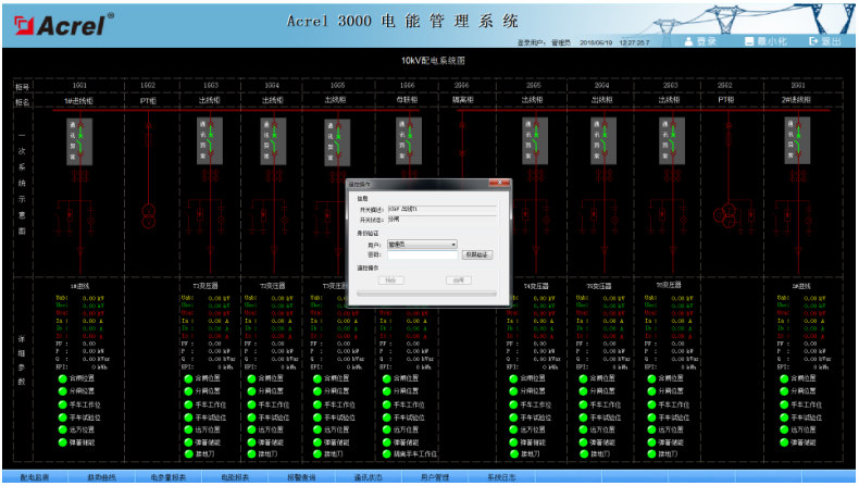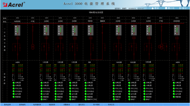 系統人機界面友好,以配電一次圖的形式直觀顯示配電線路的運行狀態,實時監測各回路電壓、電流、功率、功率因數、電能等電參數信息,動態監視各配電回路斷路器、隔離開關、地刀等合、分狀態,以及有關故障、告警等信號。