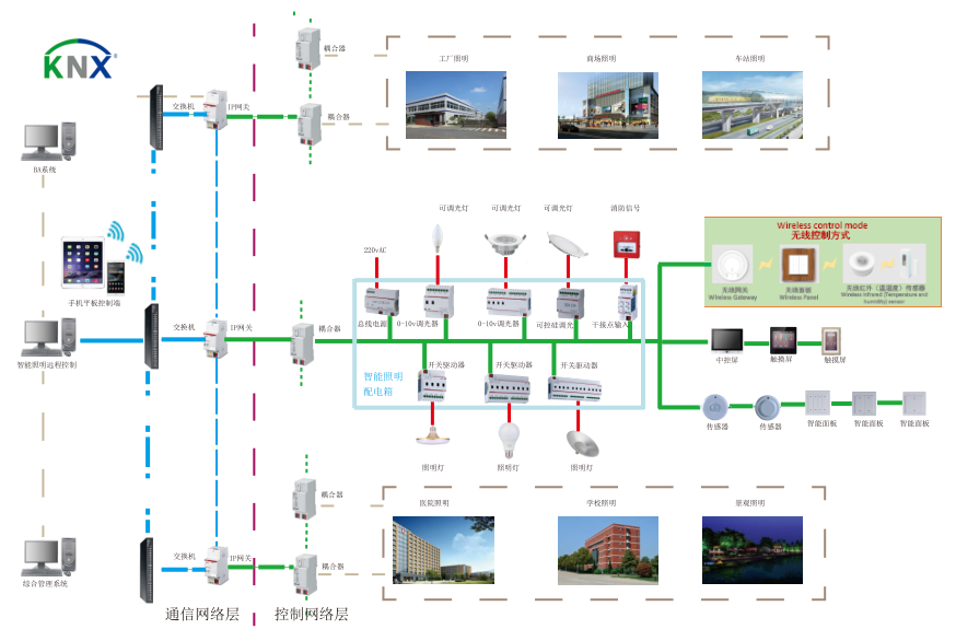 系統通過標準的2*2*0.8EIB BUS總線(即KNX總線)將所有的智能照明控制模塊連接到一起,并組成一套完整的控制系統。該系統理論最大連接控制模塊數量達58000多個,在實際項目應用中,系統即可實現照明燈具的遠程集中控制,又可實現就近控制功能。其靈活多樣的智能化控制及龐大的設備容量,特別適用于醫院、學校、酒店及各類體育場所、機場、隧道等大型公建項目照明系統的智能化控制。