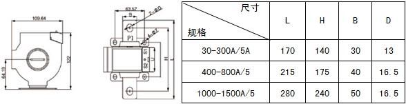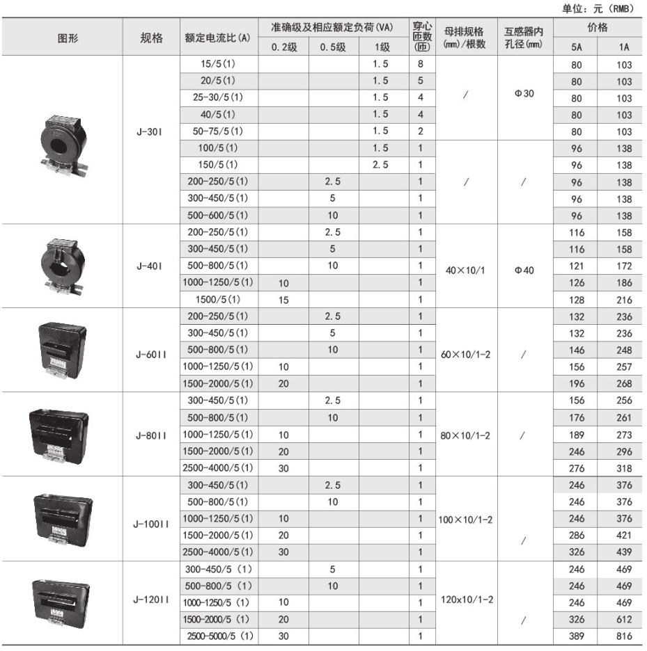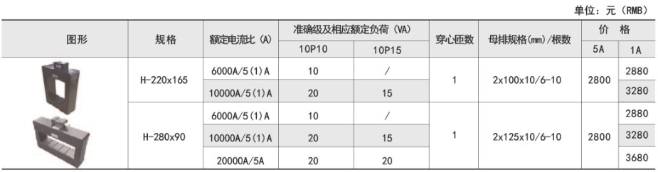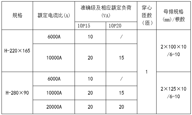 | 規格 | 額定電流比(A) | 準確級 | 穿心匝數 | 母排規格/根數 | |