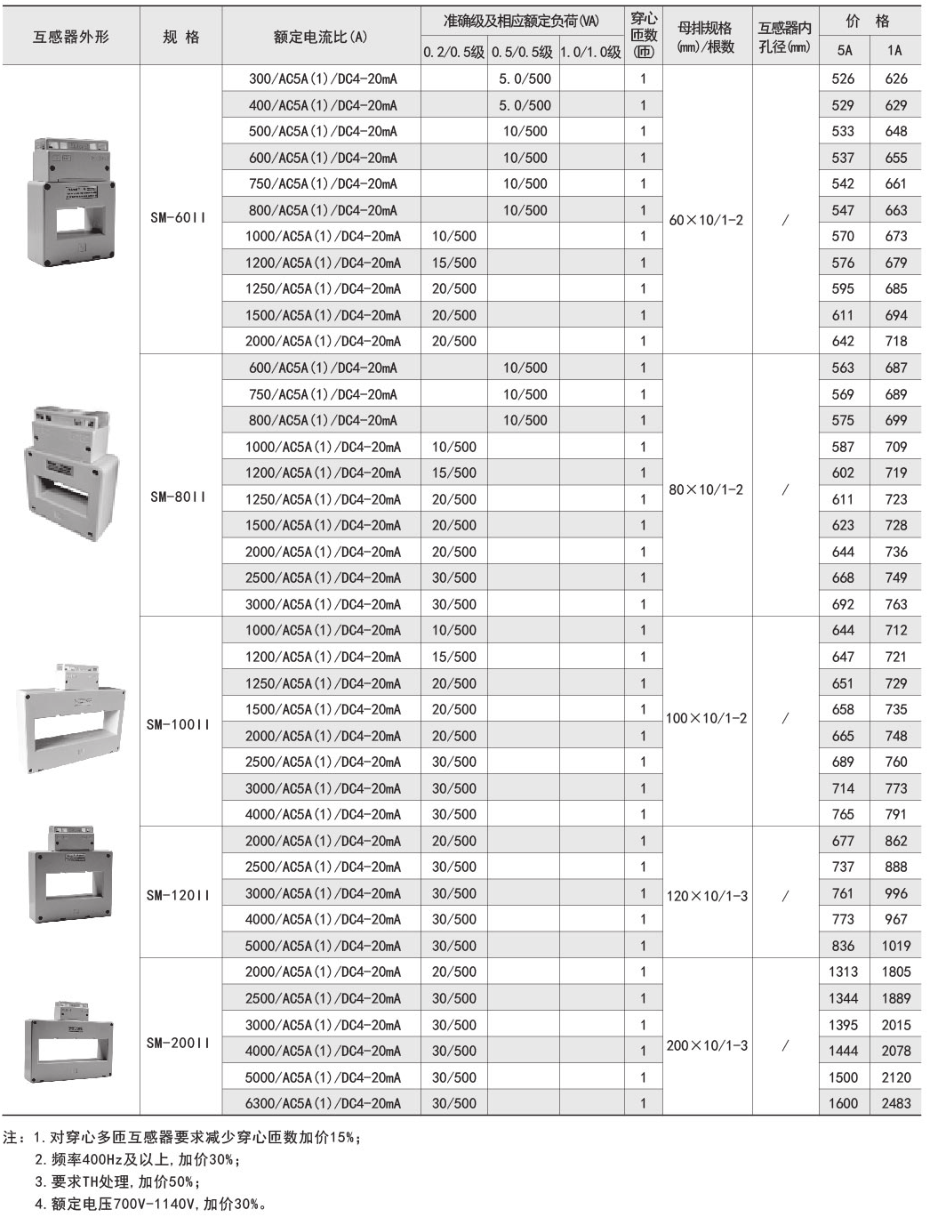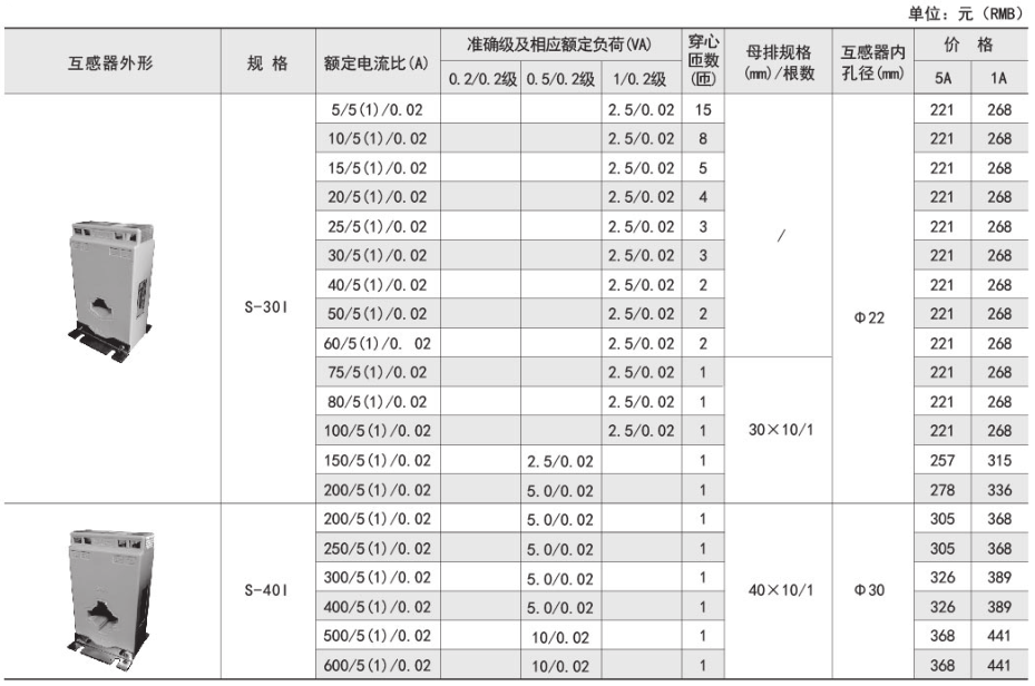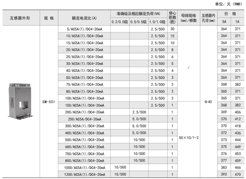 技術要求:額定電流比500A/5A/20mA;準確級0.5/0.2級;穿心匝數1匝;內孔徑φ40mm。
