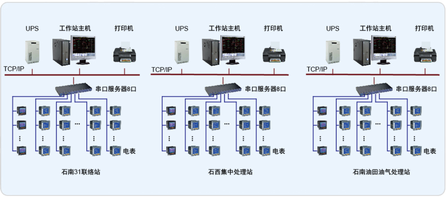 本系統針對以上需要解決的問題,對石南31聯絡站、石西集中處理站和石南油田油氣處理站三個站進行能耗管理系統改造,其中石南31聯絡站配置儀表78塊,石西集中處理站配置儀表35塊,石南油田油氣處理站配置儀表59塊,進線回路采用ACR320ELH多功能顯示儀表,出線回路采用PZ72-E4/KC,每個站為單獨一套系統。系統采用分層分布式結構,監測數據采集完成后上傳傳至各自站內監控值班監控室。