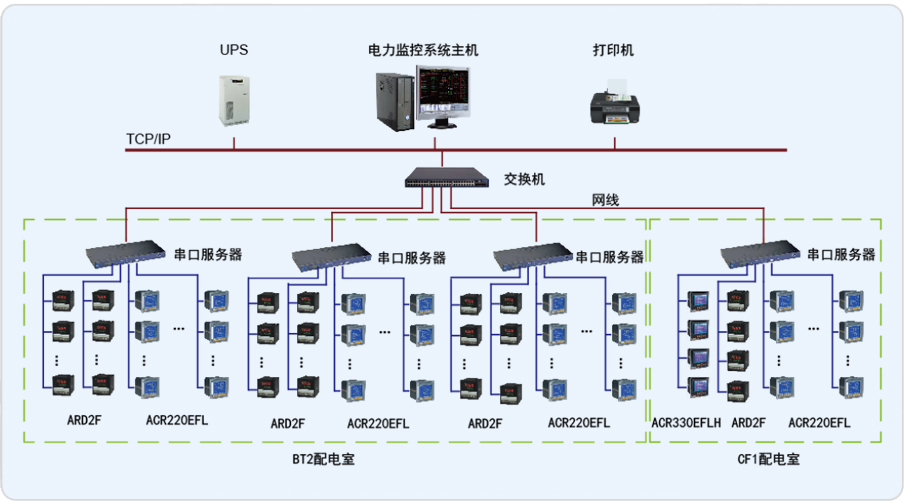 整個系統采用分層分布式結構,主控層監控主機位于BT2值班室內,各變電所間隔層配電柜內安裝有本公司ACR220EFL多功能儀表、ACR220EFLH多功能儀表、ARD2F電動機保護器,共計500多回路。BT2/CF1配電室內各儀表通過RS485總線連接至通訊管理層的串口服務器NPORT5610-16,再通過串口服務器將數據上傳至到主控層電力監控系統。